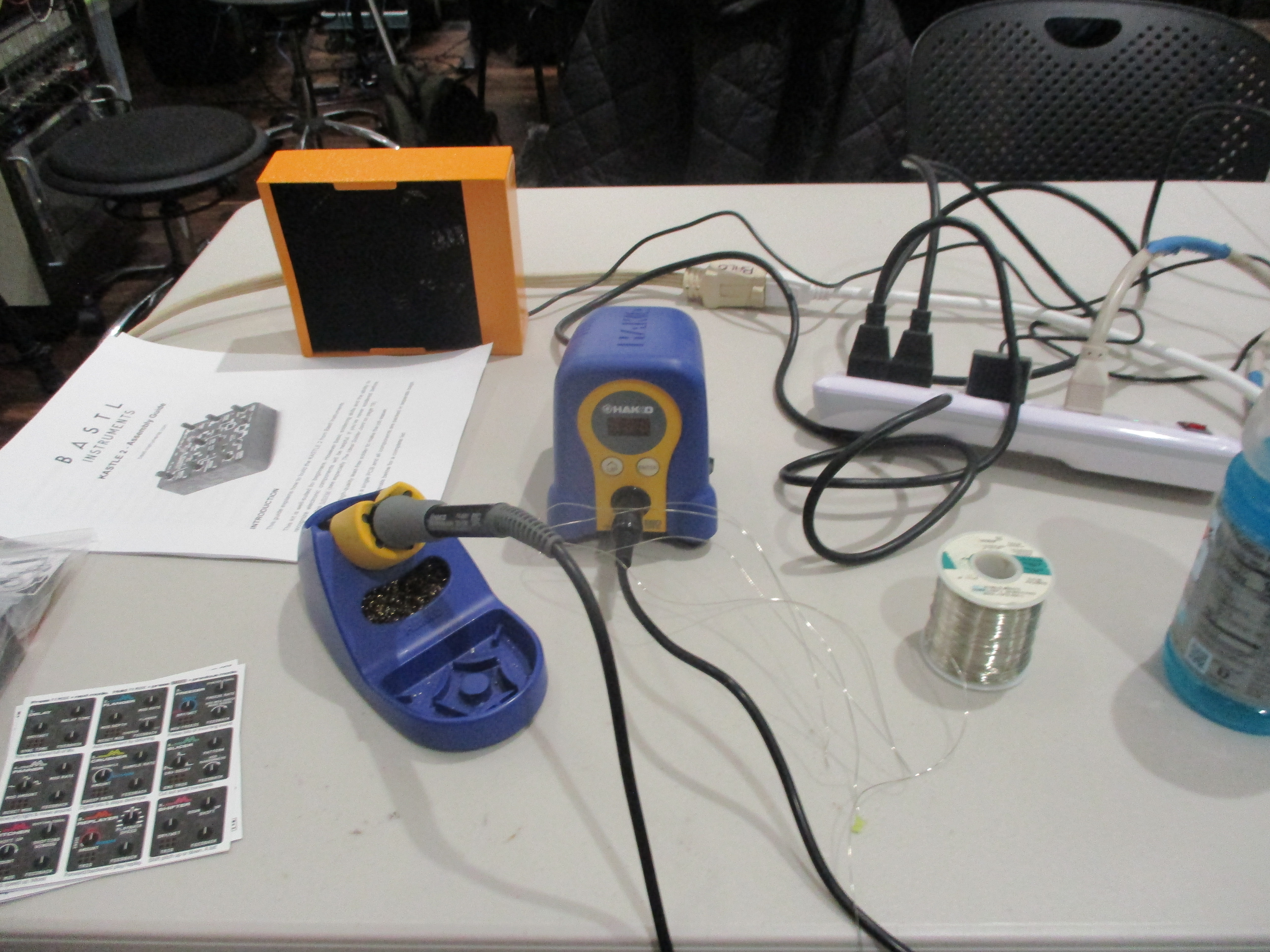 Excited and nervous, i made my way to the end of the mall where the synthesizer library class was already in session. Folding tables were set up in the middle of the library with soldering tools, a kit for each station and a exhaust fan. Its always difficult to sqash my desire to play with the synths at the library during a class. Pretty much anything you could want from a jd8000 to a rack of vintage electrical test oscilators (real ones will know what to do with those….)